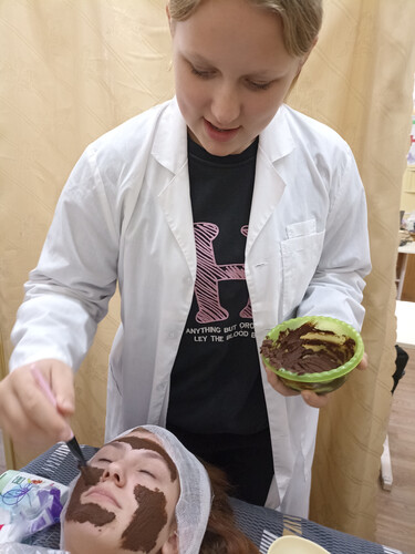 Шоколад не только вкусный продукт, но и широко применяется при уходе за кожей. Шоколад богат витаминами и минералами, которые насыщают кожу. Маска шоколадная увлажняет и питает кожу, разглаживает мелкие морщинки, повышает эластичность кожи и улучшает ее клеточный метаболизм, придает кожи здоровое сияние и выравнивает тон, улучшает настроение. На занятиях обучающиеся программы «Основы косметологии и макияж» изучили технику приготовления шоколадной маски и отработали протокол ее нанесения. После маски кожа становиться бархатистой.