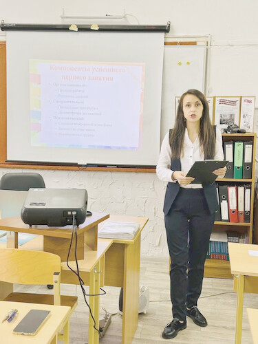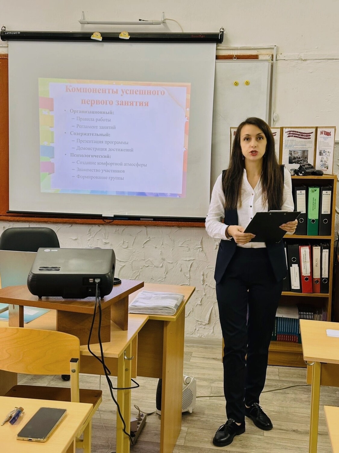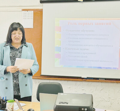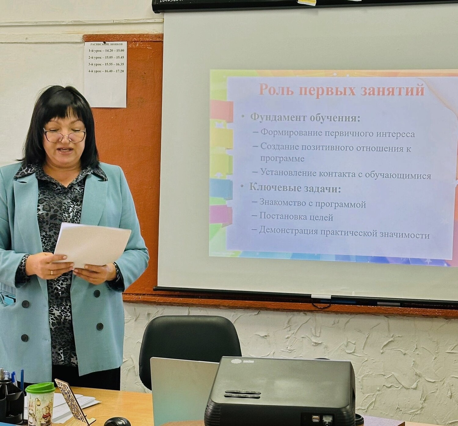 Методист Лариса Анатольевна рассказала о значении первого урока как отправной точки в формировании доверительных отношений между педагогом и обучающимися. Она подчеркнула, что именно первое занятие задаёт тон всей дальнейшей работе, помогает создать позитивную атмосферу и пробудить интерес к дисциплине.